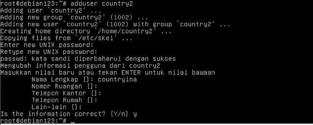 <span style="font-family: "trebuchet ms" , sans-serif;">5. </span><span style="font-family: "trebuchet ms" , sans-serif;">Ketik adduser <nama_pengguna>, maka akan membuat user baru dengan nama yang sudah </span><span style="font-family: "trebuchet ms" , sans-serif;">dimasukkan. Setelah nama pengguna dimasukkan, maka diminta untuk memasukkan kata </span><span style="font-family: "trebuchet ms" , sans-serif;">sandi untuk pengguna tersebut, dan informasi yang berkaitan dengannya.</span></blockquote>